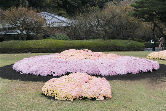 菊花花壇 是室外展示的主要方式,由于其體量很大,多被賦予一定的文化主題或擺放成特定的形狀,菊花花壇材料的應用也在不斷創新,新宿御苑在花壇中應用了一種淺桔色的菊花品種,據了解,這種盆栽菊開花后隨著溫度的降低,花瓣中的花青素重新積累,表面的花瓣花色更紅,形成漸變色的觀賞效果。