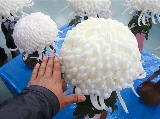 國華系列 國華系列以長勢強和花大著稱,花瓣屬于平瓣類,盛開時花朵呈球形,花瓣排列整齊均勻,花球直徑可達到25厘米到30厘米,花色除了黃色、白色和淺粉色以外,也有少數深粉色的品種,但市場接受度相對較低,其他花色均在育種時淘汰。栽植形式主要以三本(保留3個花頭)和獨本菊(案頭菊)為主。常見品種有‘國華爛漫’、‘國華越山’等。