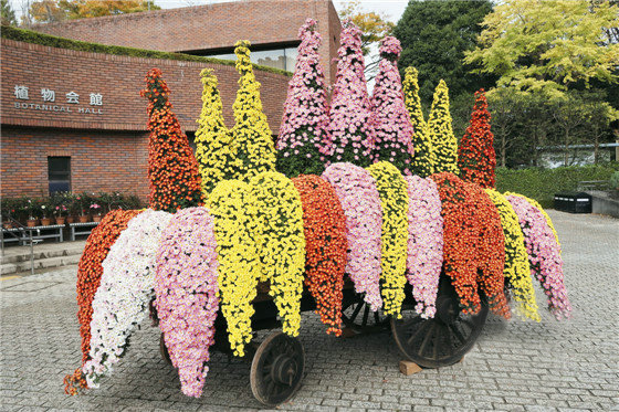 菊花造型 菊人形是日本菊花造型的獨特形式,根據不同部位的顏色需要,通過綁縛將各色的菊花枝條有序的固定在一起,形成一個個鮮活生動的菊人偶。此外,各色的大立菊、懸崖菊也很常見。在眾多的展示形式中,懸崖菊的花車造型尤為顯眼,吸引大量的游客駐足拍照。