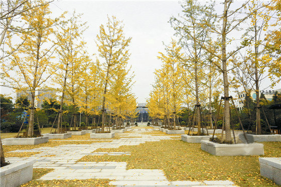 再往南是園區的中心廣場,鋪裝采用大理石與草坪相結合,胸徑28厘米左右的高大銀杏成四列種植在廣場中央,形成銀杏樹陣,規則而有序,體現中軸對稱的儀式感和莊嚴感。這些銀杏樹的樹冠彼此相連,形成一個整體外輪廓線,表現出藝術上的整體美。其樹干端直蒼勁,樹姿雄偉壯麗,蒼翠挺拔。秋天,銀杏的葉子一片金黃,一夜秋風,銀杏葉宛如一只只金黃的蝴蝶翩翩落下,碧綠的草地上鋪滿了金黃的樹葉,整個廣場變得金燦燦一片,成為整個園區內最引人注目的景觀。