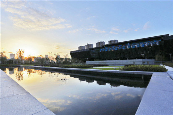 排澇站南側出水池前方的小廣場,采用草坪與色塊的組合,平整有序,線條簡潔。綠意盎然的園林景觀,中和了建筑的硬朗厚重,營造出剛柔相濟的效果。與草坪緊連的是一處長方形水景,水中種植幾株睡蓮,建筑和廣場景觀則清晰地倒映在水中,不管是朝陽升起,還是夕陽西下,都是一幅如畫美景。