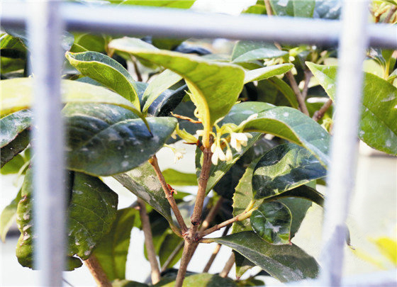 排撈站北側,是一個矩形的江水垃圾過濾池。過濾池上方沒有采用傳統的硬質欄桿,而是創新性地用“桂花網片”進行圍合,先在外圍拉起1.2米高的鐵絲網,再將同樣高度的矮化四季桂和月季種植在鐵絲網內側,形成一圈綠籬,既可以充當護欄,又顯得生態美觀。