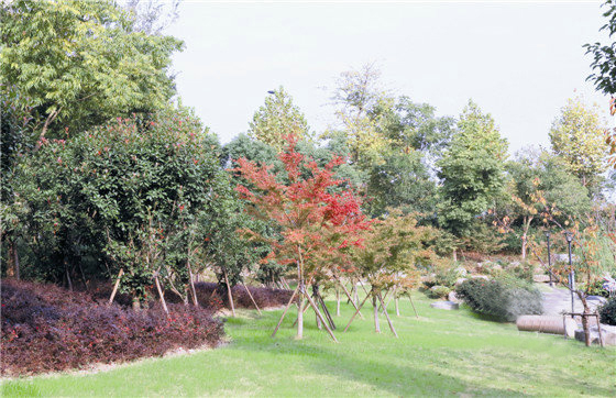 中心廣場再往南,是一片疏林草地,通過微地形營造出開闊的空間。植物配置簡潔大方,上層種植香樟、無患子、雪松等高大樹木,中層種植桂花、雞爪槭、紅楓等觀花和觀葉植物,下層種植紅花檵木、金葉大花六道木、八角金盤、海桐等,并將金葉女貞球、紅葉石楠球等點綴其中,形成層次飽滿、季相豐富的園林景觀。特別是深秋時節,疏林草地依然是一片綠色,與不遠處金黃的銀杏樹陣形成鮮明對比,營造出豐富的色彩感。